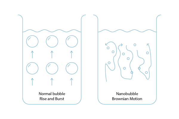 Nanobubbles are neutrally buoyant and can remain suspended in liquid for months and due to the Brownian Motion will travel randomly throughout the body of water. This unique behavior enables nanobubbles to provide a homogeneous distribution of gas throughout the water column and efficiently aerate the entire body of water.